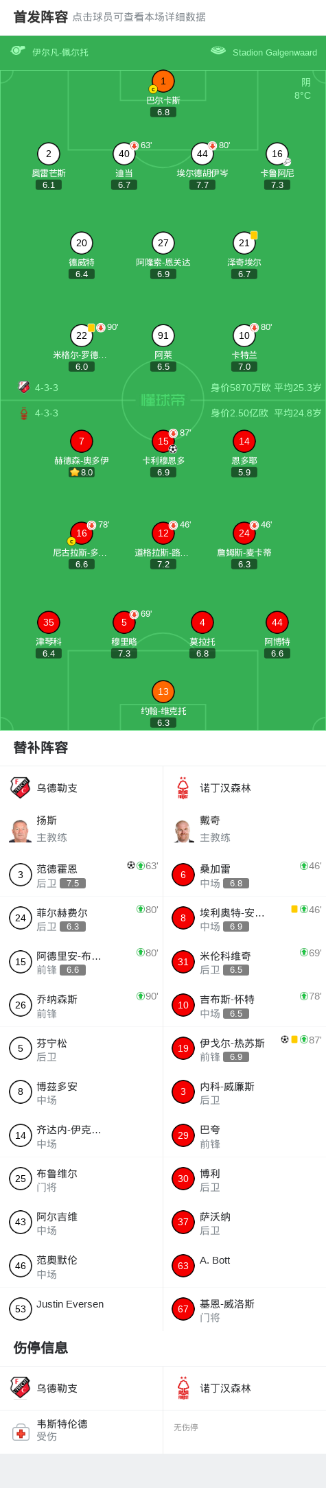 北京时间12月12日,欧足联欧洲联赛联赛阶段第6轮,乌德勒支迎战诺丁汉森林。比赛进行中,卡利穆恩多为诺丁汉森林率先取得进球。随后,卡鲁阿尼送出助攻,范德霍恩破门得分,帮助乌德勒支扳平比分。临近结束前,伊戈尔-热苏斯攻入关键一球,助诺丁汉森林再度领先。全场比赛结束,最终比分为乌德勒支 1-2 诺丁汉森林。