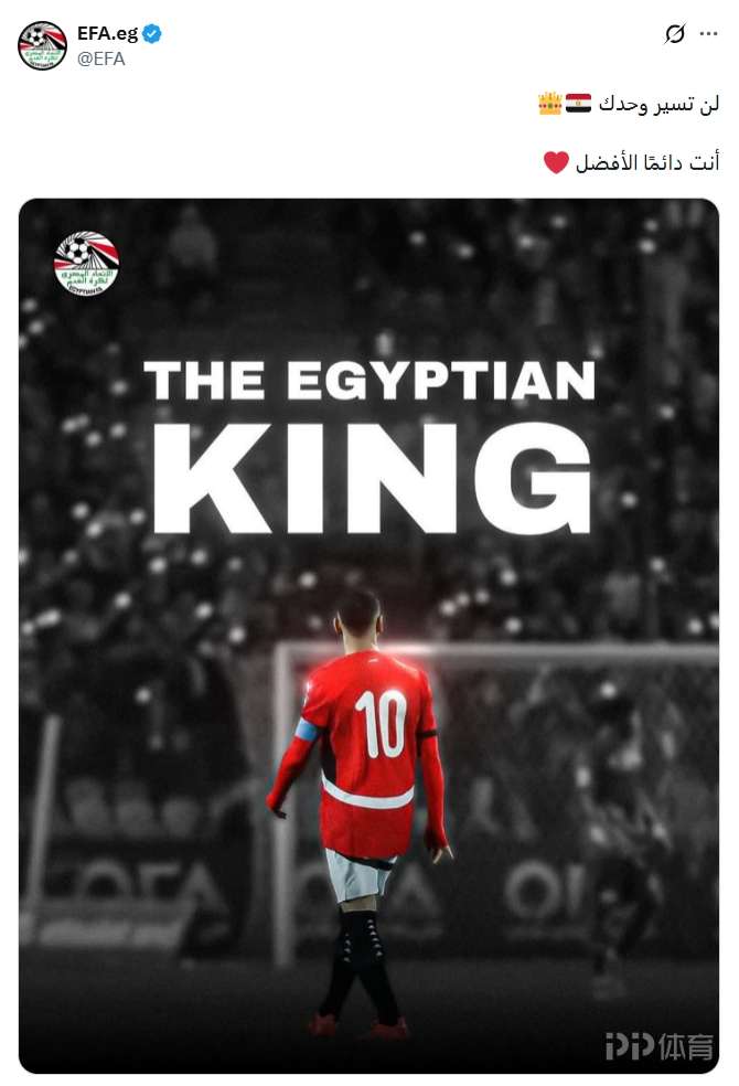 埃及足协晒出了一张以萨拉赫为主角的海报,海报中配文“埃及国王”,埃及足协还附文字写道:“你永远不会独行,你永远是最出色的。”