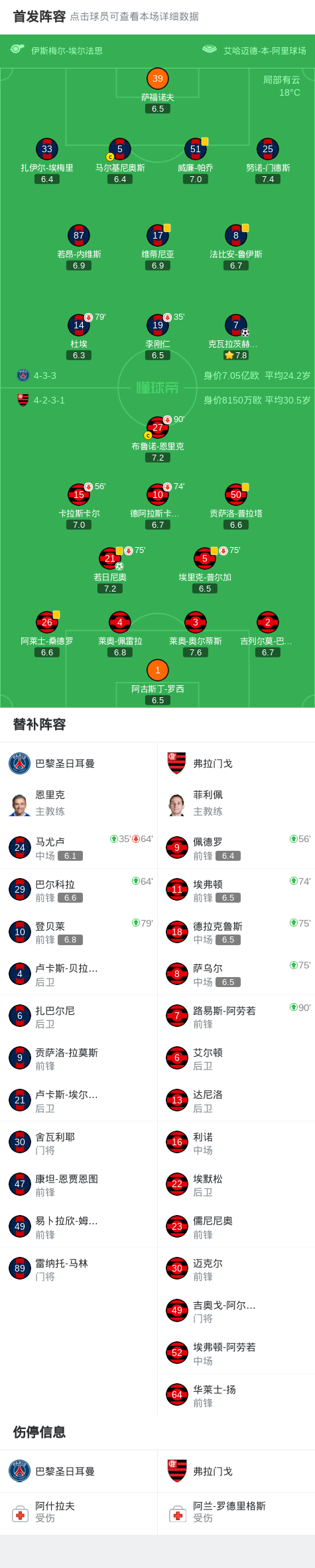 90分钟战报:巴黎1-1弗拉门戈,KK破门,若日尼奥点射扳平